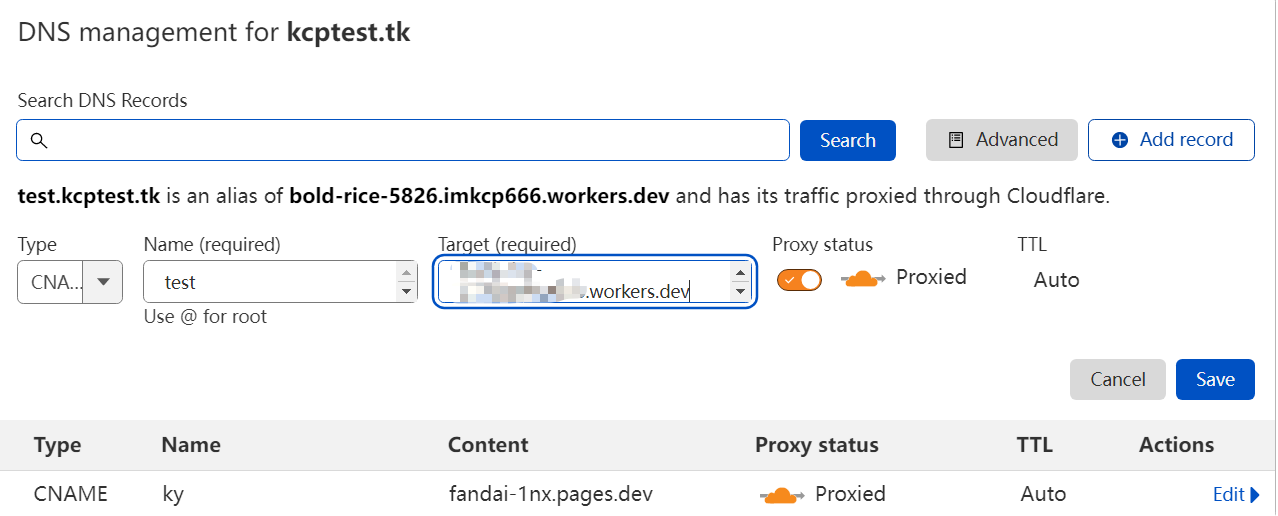 2.登录你的cf账号,点进你的域名,点DNS选项,如图添加一个cname解析到workers的域名,不带https://,要开小云朵