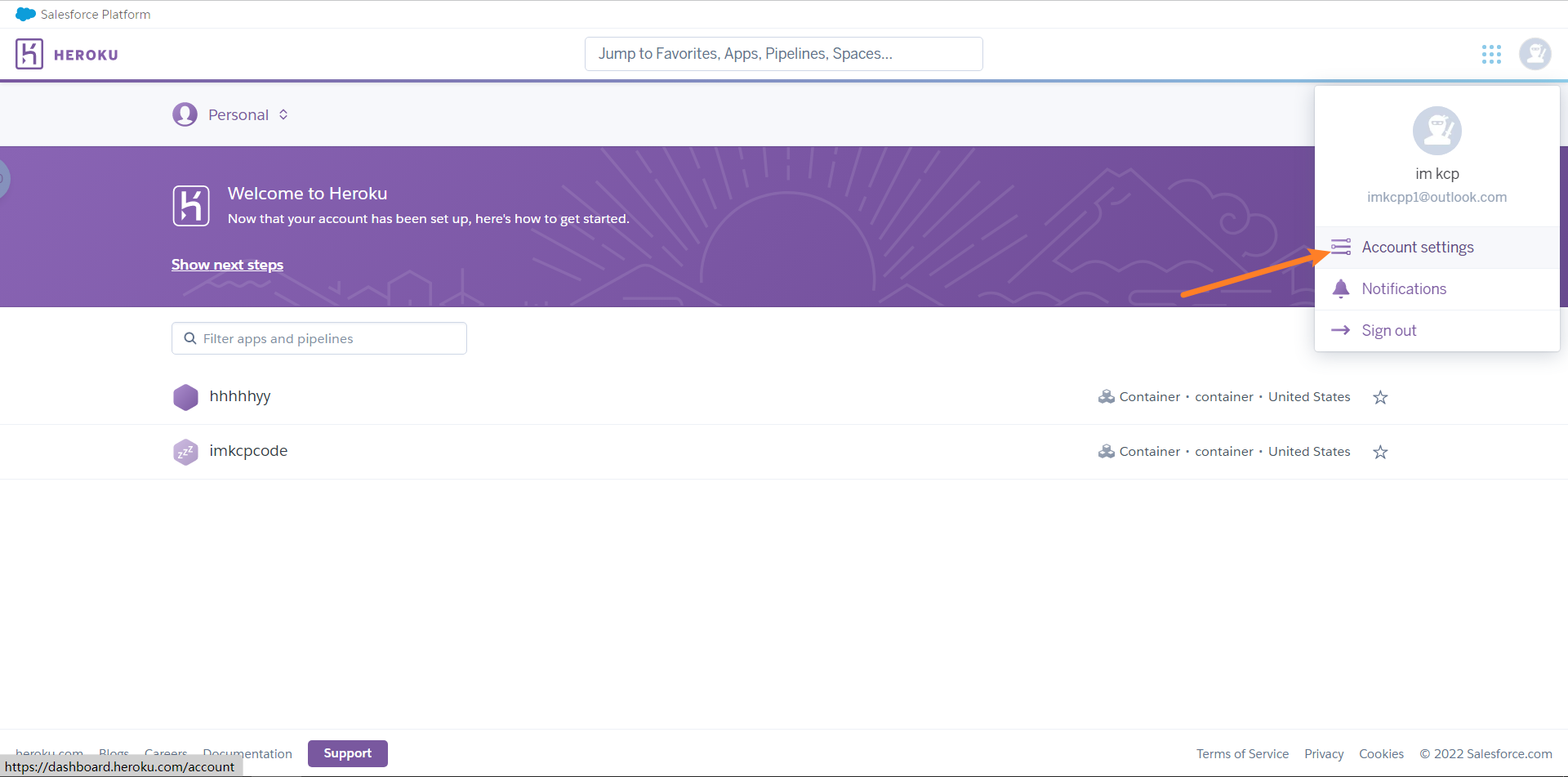 打开heroku的官网登陆后我们需要获取heroku账号的api_key,按图点击