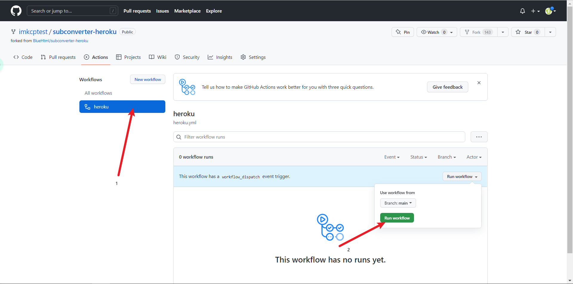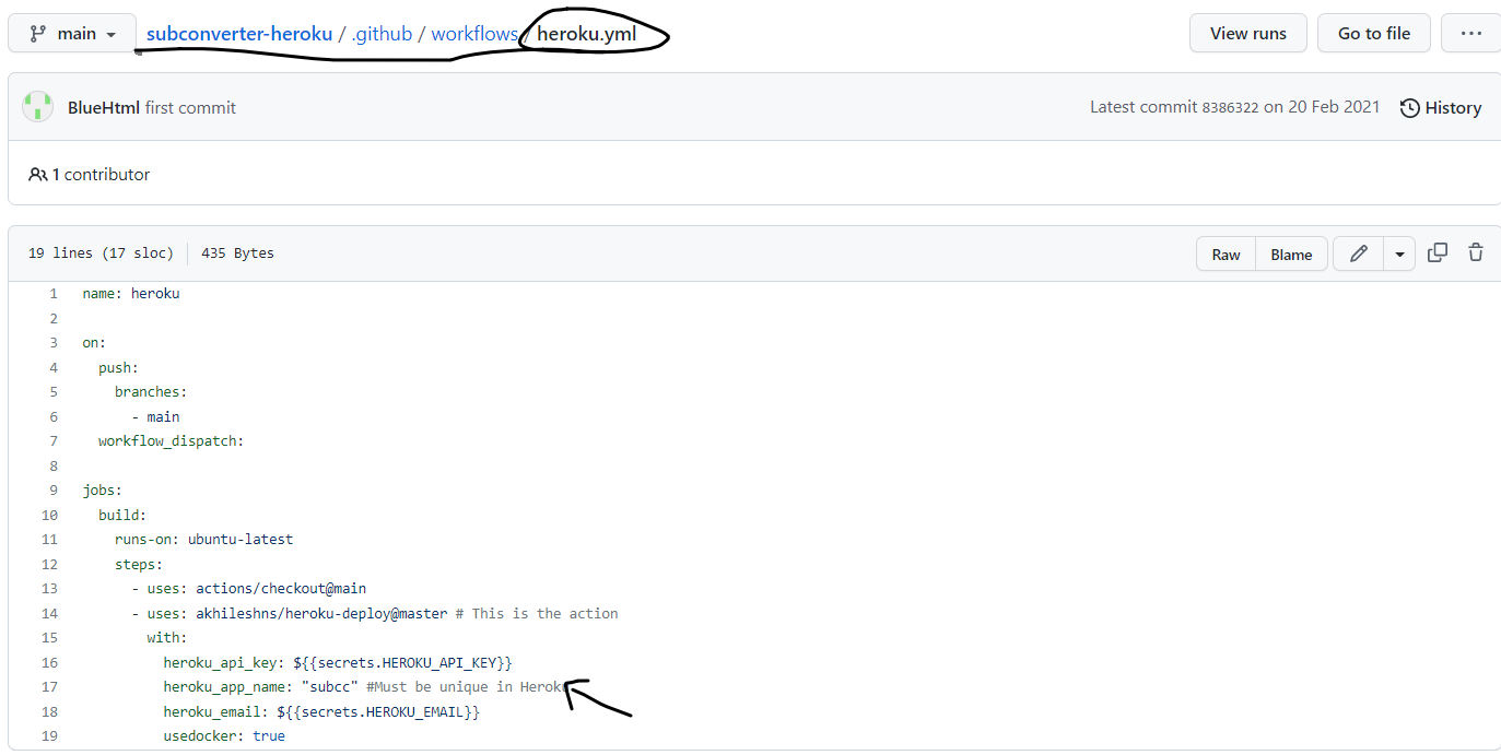 然后如图,编辑.github/workflows/heroku.yml这个文件,修改heroku_app_name这个的值,不能重复,我建议是在heroku首页新建一个项目,取个不重复的名字,然后复制名字到这并取消创建
