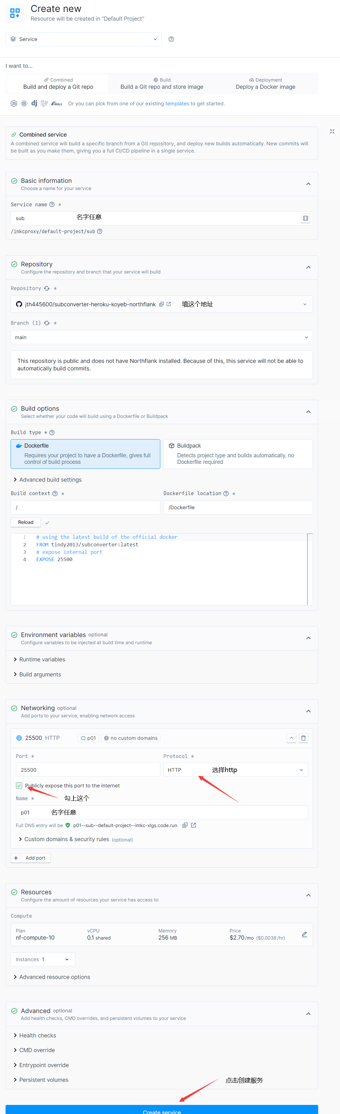 如图,图中地址为: https://github.com/jth445600/subconverter-heroku-koyeb-northflank ,记得选择http顺便打勾
